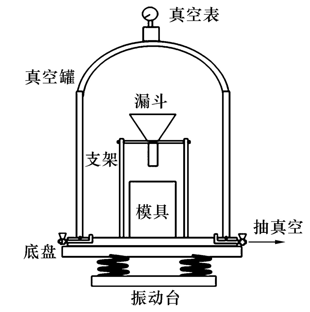 真空振動澆注裝置示意圖見圖1。將混合漿料(加水量8%(w))放于裝置的漏斗中,抽真空至 -0.09MPa后保壓30min, 打開振動臺使其振動頻率為60Hz, 待漿料完全流進模具后再振動1min, 停止振動后放入空氣。機壓成型過程:將坯料(含水量8%(w))放入壓磚機模具內(nèi),在200MPa壓力下保壓90s。兩種工藝的坯體成型后均于100 ℃干燥72 h, 于1400 ℃氮化燒結(jié)8h。
