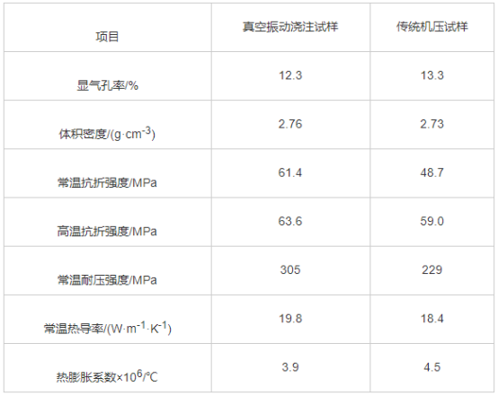 真空振動澆注試樣和機壓試樣的常規(guī)性能測試結(jié)果見表2。真空振動澆注成型過程中,其坯料相對于機壓成型的坯料分布更均勻,氣體排出充分,更有利于致密化,因此得到的試樣顯氣孔率相對較低,體積密度略高。同時,真空振動澆注試樣常溫抗折強度、高溫抗折強度和常溫耐壓強度與機壓試樣相比分別提高了26.0%、24.7%和33.2%,常溫熱導率比機壓試樣高7.6%,而熱膨脹系數(shù)則比后者低13.3%。綜合來看,真空振動澆注試樣的常規(guī)性能優(yōu)于機壓試樣的常規(guī)性能。