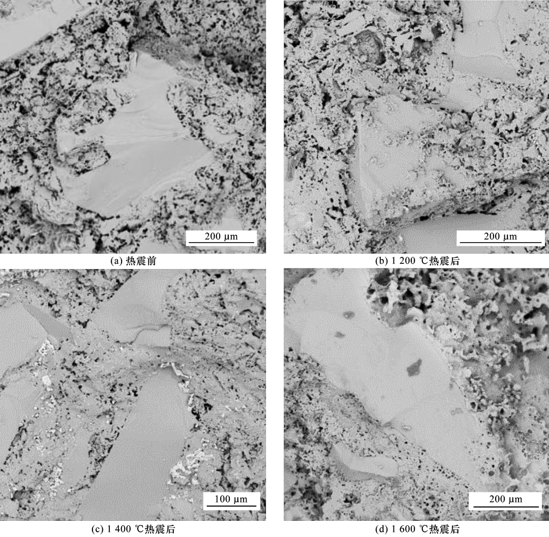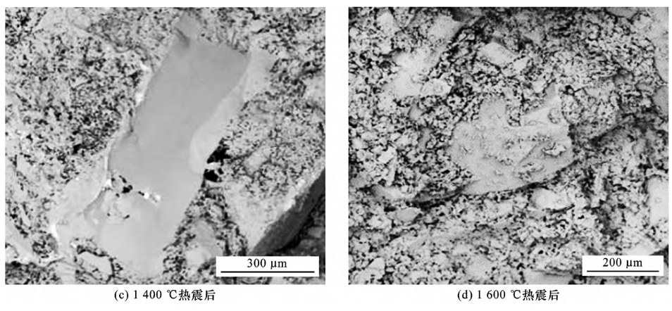 對于Si3N4-SiC耐火材料,SiC是增強相且質(zhì)量分數(shù)(>70%)較大,Si3N4相主要起黏結(jié)作用。當兩相界面結(jié)合強度足夠高時,裂紋擴展過程中SiC相以穿晶斷裂為主,消耗更多的斷裂能。熱震試驗后,試樣界面受到氧化及熱應力損傷,導致兩相結(jié)合強度下降,SiC相沿晶斷裂占比增大。裂紋在Si3N4相中擴展所消耗的斷裂能較少,導致剩余斷裂韌性的降低。真空振動澆注試樣熱震前后斷口處的微觀形貌見圖4。樣品斷口處玻璃相含量可反映試樣氧化的程度。由圖4可以看出:熱震溫度<1400 ℃時,氧化痕跡不明顯;當熱震溫度為1600 ℃時,斷口表面有SiO2玻璃相析出,試樣氧化程度明顯增加。機壓試樣熱震前后斷口處的微觀形貌見圖5。由圖5可知,隨熱震溫度的升高,試樣氧化程度加深,機壓試樣在1600 ℃熱震后氧化腐蝕更嚴重,SiO2玻璃相已布滿斷口表面,說明試樣內(nèi)部結(jié)構(gòu)已受到嚴重損害。
